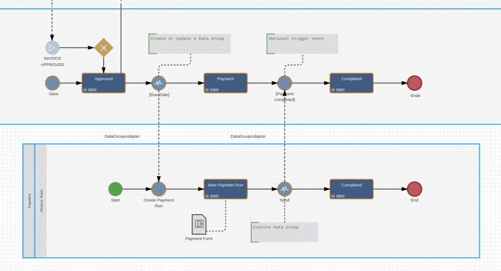 As soon as the payment workflow is completed (payment data is send to the banking system), the Adapter can optional also execute all related invoice documents by a specific workflow event in the BPMN 2.0 model. In this example the event ‘Payment completed’ to finish the invoice workflow.